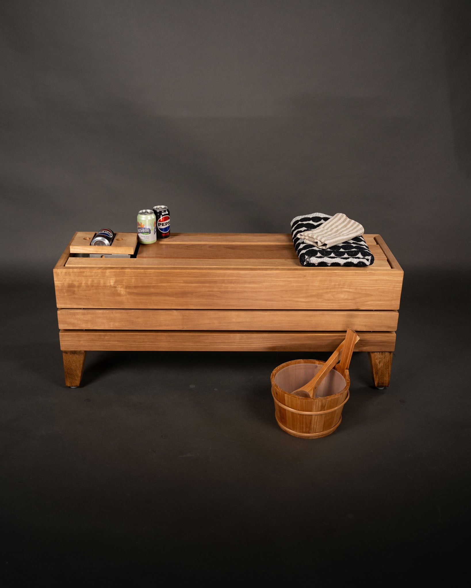 Järjestelmän lisäksi valikoimastamme löytyy Pekka Bench designpenkki, johon 12 tölkin kylmäjuoma-automaatti on valmiiksi integroituna.